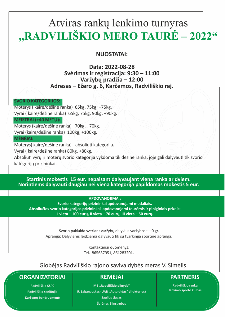 2022-07-31 LT Sport Atviras rankų lenkimo turnyras “Radviliškio Mero Taurė 2022“ (nuostatai) Dalintis: Share on Facebook (Opens in new window) Dalintis Facebook
